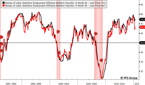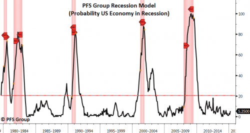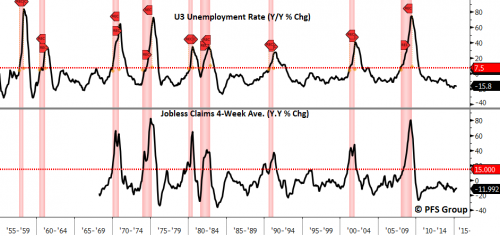 Un altro grafico che contraddice con forza la speculazione di Zero Hedge riguardo una fantomatica recessione negli Stati Uniti è quello che mostra la situazione del mercato del lavoro. Solo quando vediamo il tasso di disoccupazione andare oltre il 7,5% su base annuale o la media mobile a 4 settimane di richieste di sussidi di disoccupazione sale oltre il 15% su base annua dovremmo iniziare a preoccuparci. E’ importante sottolineare che entrambi i tassi annuali non sono neanche vicini alle soglie menzionate che potrebbero fornire un segnale di allarme per una recessione.