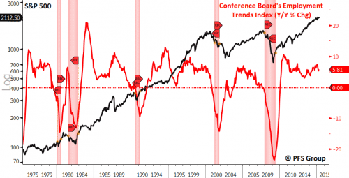 Un punto di vista diverso sul mercato del lavoro ci viene offerto dall’indice del trend sull’occupazione del Conference Board. Quando il tasso annuale di questo indice scende in territorio negativo abbiamo la possibilità di entrare in una fase di recessione entro alcuni mesi. Ma l’ultimo calo in territorio negativo si è verificato nel settembre 2007, tre mesi prima dell’inizio dell’ultima recessione, in linea con l’anticipo di 4 mesi fornito dallo stesso indice prima della recessione del 2001. Con l’attuale lettura annuale positiva del 5,81% siamo ben lontani da qualsiasi segnale di recessione.