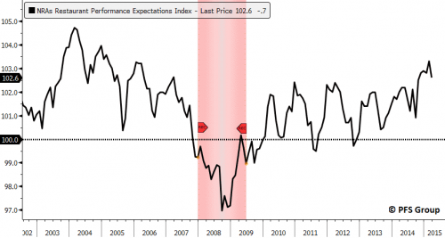 Guardando invece ai consumi, sarebbe molto strano per l’economia degli Stati Uniti entrare in recessione quando la spesa dei consumatori sui prodotti discrezionali (come mangiare fuori in un ristorante) è forte come è sempre stata. Durante l’ultima recessione si è verificato un calo dell’indice delle aspettative di performance dell’Associazione Nazionale dei ristoratori sotto il livello 100 e, alla lettura attuale, siamo ora appena al di sotto ai massimi di 9 anni e ben al di sopra ai livelli associati al rischio di recessione.