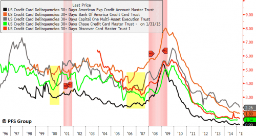 Prima delle ultime due recessioni statunitensi l’insolvenza sulle carte di credito hanno iniziato a salire (aree evidenziate in giallo). Qualcuno vede un aumento dei tassi di insolvenza attualmente?