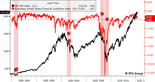 Bloomberg ha un indice composito sugli spread creditizi che chiama Bloomberg US Financial Conditions Index (BUSFCI) dove una lettura sotto lo zero indica una stress finanziario, mentre una lettura sopra lo zero indica che siamo al di sotto dei livelli medi di stress finanziario. Il BUSFCI caduto in territorio negativo ben prima dell’arrivo delle recessioni precedenti ma oggi in territorio positivo.