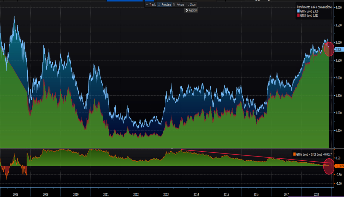 Un’altra indicazione preoccupante arriva quando si va ad osservare un grafico dei rendimenti tra la carta a 3 e 5 anni nel lungo periodo: era infatti dall’ottobre del 2008 che non si presentava una situazione del genere.