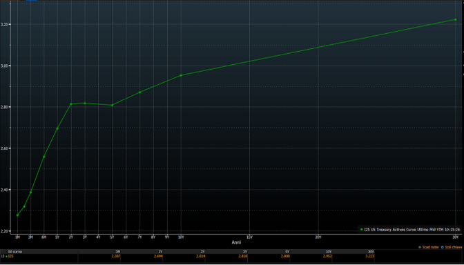 Arrivano segnali preoccupanti dai titoli governativi statunitensi: il differenziale tra i bond a 3 e 5 anni è sceso sotto lo zero, determinando un’inversione della parte breve della curva. Lo yield della scadenza a 3 anni è infatti al 2,818% mentre quella a 5 rende il 2,808%.