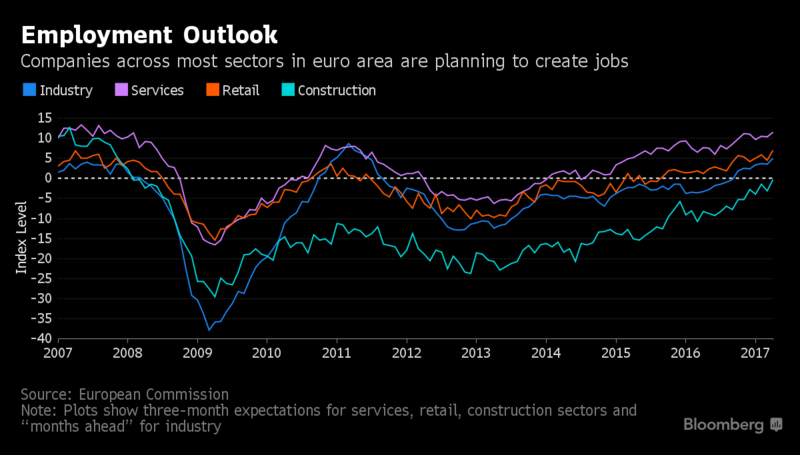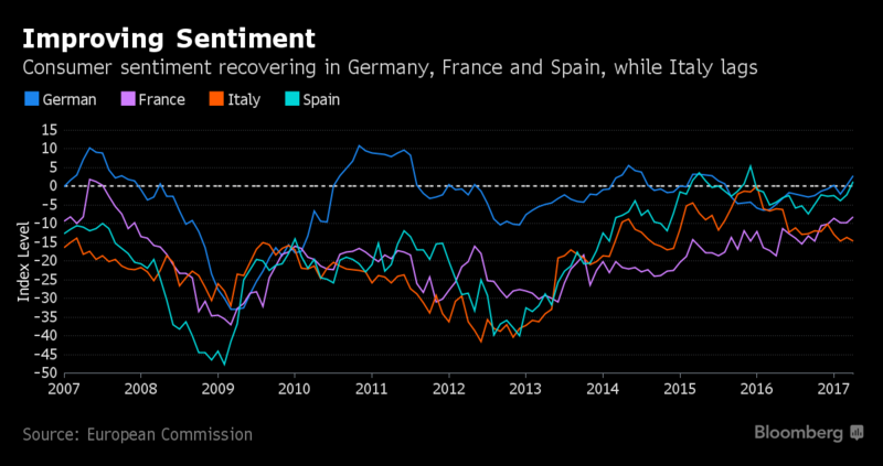 Per gli analisti, strettamente correlato ai dati sulla disoccupazione è la fiducia dell’Eurozona. Migliori opportunità di trovare un impiego incrementano la propensione al consumo. Ad aprile il sentiment economico è salito ai massimi di 10 anni. Bisogna precisare, però, che mentre i consumatori in Germania, Francia e Spagna sono piuttosto ottimisti, stesso discorso non vale per gli italiani, secondo i quali i benefici derivanti da migliori prospettive economiche sono stati scarsi.