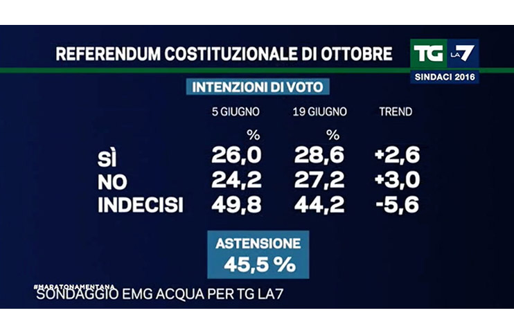 Nel dettaglio, il 28,6% degli italiani è favorevole alla riforma costituzionale introdotta dal ddl Boschi, mentre il 26,2% voterà per il No. Rispetto agli scorsi rilevamenti, però, il fronte del Si sta recuperando lo svantaggio, quindi nelle prossime settimane ci potrebbe essere il sorpasso.