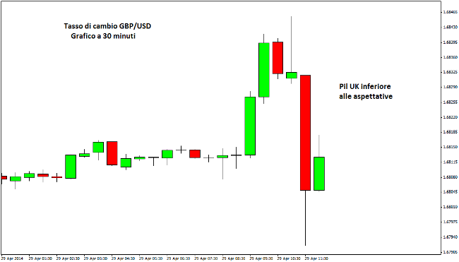 Stamattina è stato pubblicato il dato relativo al pil del Regno Unito nel primo trimestre. La lettura preliminare ha evidenziato un miglioramento a +0,8% su base trimestrale rispetto al +0,7% del periodo precedente. Tuttavia il risultato è inferiore alle aspettative del mercato, che aveva stimato un progresso maggiore a +0,9%. Su base annua l’incremento del pil è del 3,1%, leggermente più basso del 3,2% indicato dagli analisti finanziari. Il pil sotto le attese ha fermato la corsa della sterlina, che ieri era salita sui massimi da oltre 4 anni sopra 1,6850 dollari.