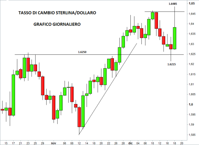 Il cable ha comunque ripiegato molto dai massimi, tornando stanotte sotto 1,6370, a seguito dell’annuncio di ieri sera da parte della Federal Reserve sull’avvio del tapering a partire da gennaio. Non si ferma, invece, il rally del cross sterlina/yen, che ha superato anche la resistenza di 170. I prezzi si sono spinti fino a 171,17, ai massimi da ottobre 2008. Pesante sell-off poi per il cross euro/sterlina, che precipita sotto 0,8340 sui minimi da quasi due settimane. Rimbalzone per il cross sterlina/franco, che sale fin sopra 1,4670 dopo aver toccato un minimo mensile a 1,4378.