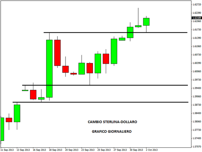 Ieri l’indice Pmi manifatturiero di settembre ha evidenziato un calo a 56,7 punti dai 57,1 punti del mese di agosto (dato rivisto leggermente al ribasso rispetto alla stima precedente di 57,2 punti). Gli analisti si aspettavano un miglioramento a 57,5 punti. Sul forex il tasso di cambio sterlina-dollaro è ancora ben acquistato, tanto che la quotazione è tornata prepotentemente sopra 1,62. Ieri il cable era salito sui massimi di inizio gennaio scorso a 1,6260, ma poi aveva perso 100 pip dai top intraday a seguito della publicazione del buon dato sull’Ism manifatturiero USA.