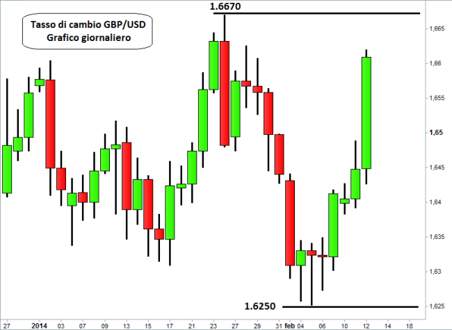 Il banchiere centrale canadese non ha comunque cambiato la propria forward guidance, introdotta lo scorso agosto, anche se ha sottolineato che prima di alzare i tassi di interesse saranno valutati anche altri indicatori macroeconomici e quindi non solo il mercato del lavoro. Carney ha precisato che il costo del denaro resterà fermo sull’attuale livello minimo dello 0,5% ancora per qualche tempo. Secondo gli analisti valutari sarà comunque la BoE la prima banca centrale tra i paesi più sviluppati ad aumentare i tassi di interesse. Ciò sta favorendo la sterlina, che si sta nuovamente avvicinando ai massimi di inizio anno posti in area 1,6670.