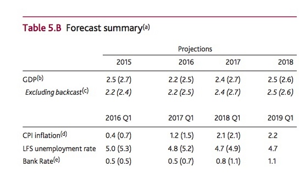 La tabella seguente riassume i nuovi tagli alle previsioni di crescita apportati dalla Bank of England (le stime precedenti sono indicate tra parentesi):