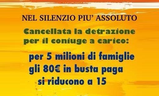 "Renzie continua a raccontare la balla degli 80 euro al mese, in complicità con giornali e tv di regime. Basterebbe andare a leggersi il testo della legge delega ora in discussione al Senato per scoprire che Renzie ha tolto, alle stesse categorie cui ha promesso gli 80 euro, le detrazioni per il coniuge a carico che valgono 700 - 800 euro all’anno, 65 euro al mese circa. La campagna pubblicitaria del venditore di pentole di Firenze finanziata con il sangue delle famiglie italiane. Un voto di scambio a 15 euro".