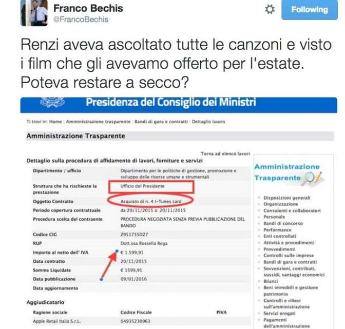 Questa volta, però, l’acquisto sarebbe ancora più ingente, poiché sembra che Renzi abbia dato mandato per l’acquisto di ben quattro iTunes Card, del valore complessivo di 1.600€. Naturalmente non c’è nulla di strano in tutto questo, se non fosse che Franco Bechis ha trovato questi conti all’interno delle voci di spesa della Presidenza del Consiglio.