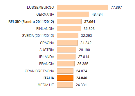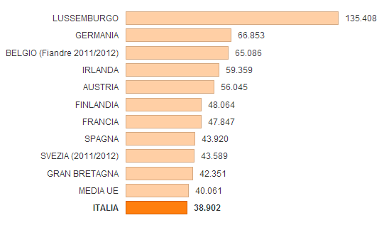 Da sottolineare inoltre che la media UE presente in entrambi i grafici (24.846 salario minimo – 40.061 salario massimo) tiene conto anche di numerosi paesi dell’est, in cui lo stipendio è molto più basso, ma proporzionato a prezzi al consumo e costo della vita parecchio differenti.