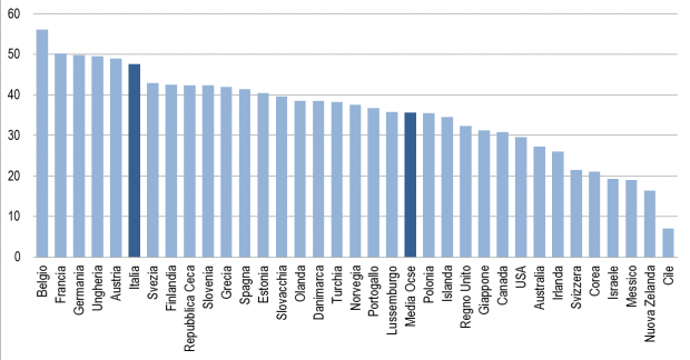 Come vediamo dal grafico seguente, le statistiche dell’OCSE fotografano una bella differenza tra l’Italia e la media europea per quanto riguarda il cuneo fiscale: 47,6% VS 35,3%.