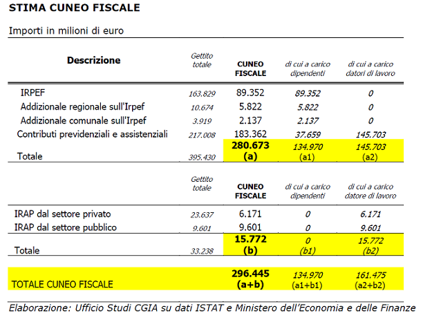 Secondo i dati della CGIA di Mestre il cuneo fiscale in Italia vale circa 296,4 miliardi, di cui: