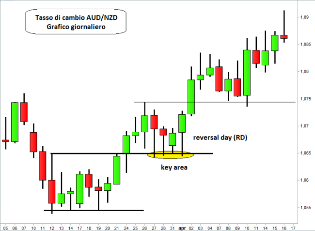 Le candele di inversione del trend possono essere utilizzate sia quando appaiono alla fine di una tendenza sia se trovano un punto d’appoggio su una key area, ovvero una zona chiave del prezzo. Le reversal day (RD) identificano l’esaurimento di una tendenza e allo stesso tempo mettono in mostra una potenziale forte ripartenza dei prezzi nella direzione opposta. Questa ripartenza può essere notevole se c’è un punto d’appoggio significativo, rafforzato dalla presenza di un’area di supporto o di resistenza principale del mercato. Per comprendere meglio le potenzialità delle RD in determinate situazione del mercato, andiamo ad analizzare un esempio.