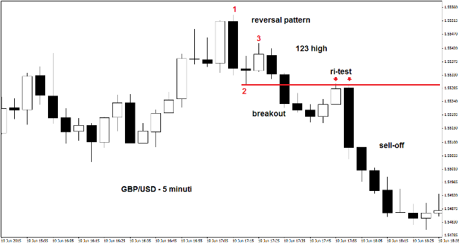 Il grafico mostrato in alto sul tasso di cambio sterlina/dollaro (GBP/USD), il cosiddetto “Cable”, time frame a 5 minuti, mette in evidenza un reversal pattern sui top intraday che da lì a poco mette in mostra un tipico 123 high. Il breakout ribassista del punto numero 2 fa scattare il segnale short, che si consolida grazie al fallimento del ri-test dello swing point (ex supporto al punto 2, ora resistenza). Il pattern darà vita a un interessante movimento ribassista nei minuti successivi.