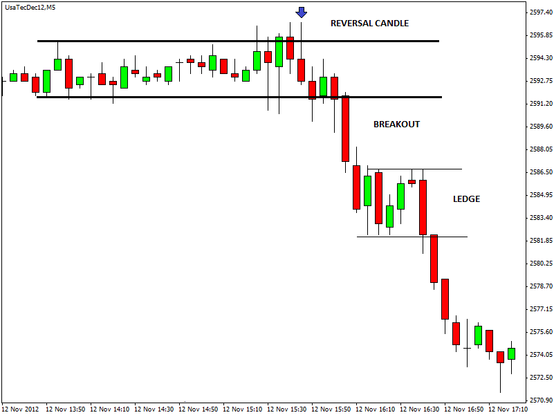 Nell’esempio in alto sull’indice azionario Nasdaq, grafico a 5 minuti, si può notare la formazione di una reversal candle in zona di resistenza che segnala l’inizio di una forte discesa dei prezzi nei minuti successivi. La presenza di una congestione sui top intraday aumenta il carburante della discesa a seguito del breakout ribassista del micro-supporto.