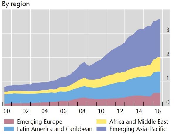 C’è però una Regione tra i mercati emergenti in cui il credito in dollari americani è diminuito: nella zona del centro, est e sud-est dell’Europa, anche conosciuta come Europa emergente. Qui, il debito in dollari è stato ridotto a 8 miliardi di dollari nel secondo e terzo trimestre del 2016.
