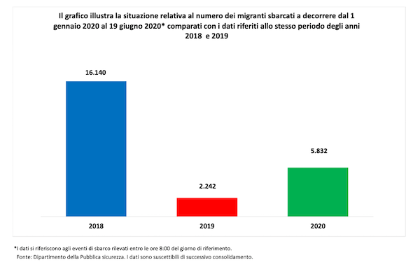 Come si può vedere dal cruscotto statistico consultabile sul Ministero dell’Interno, dal 1 gennaio al 19 giugno 2020 sono sbarcate in Italia complessivamente 5.832 persone, contro le 2.242 dello stesso periodo di quando al Viminale c’era Salvini.