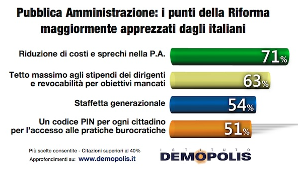 A questi interventi si aggiungono la sburocratizzazione della pubblica amministrazione e le riforme costituzionali: "la riforma e le semplificazioni della burocrazia, afferma il direttore di Demopolis Pietro Vento, sono ritenute importanti dal 52% degli italiani, ma ancor di più dal tessuto produttivo: rappresentano un’attesa prioritaria per il 67% degli imprenditori".