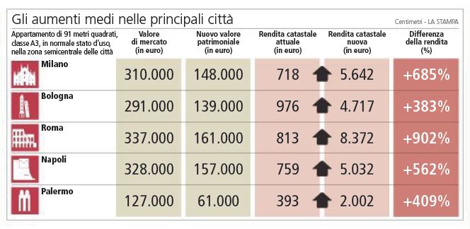 Il catasto uscente dalla riforma, alla luce di tutti questi nuovi criteri di calcolo, sarà allora meno iniquo, ma, allo stesso tempo, potrebbe far scattare degli aumenti, come illustrato nella tabella seguente, fino al 60%, come stimato dall’osservatorio immobiliare Nomisma. E ciò potrebbe incidere su un mercato immobiliare già al collasso.