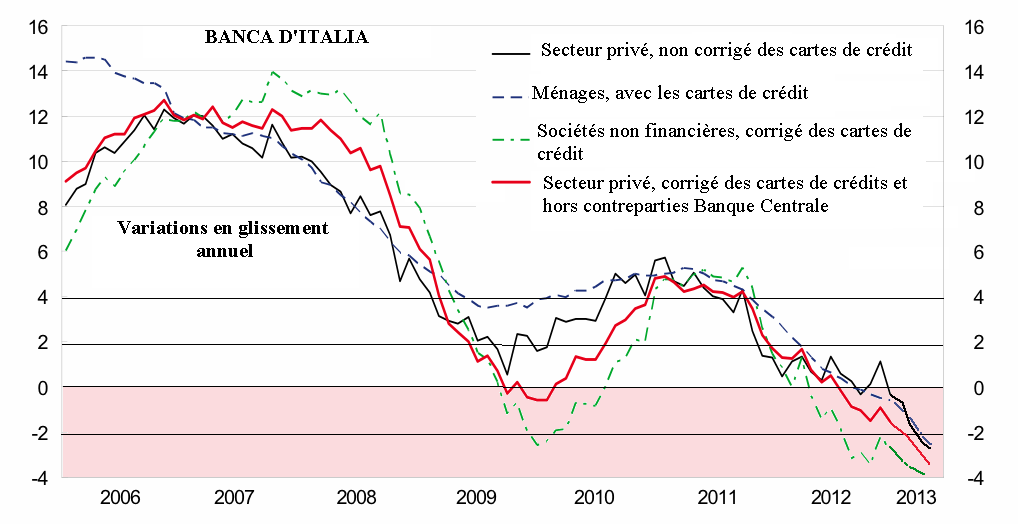 Queste politiche di svalutazione interna, che vengono eufemisticamente chiamate politiche di austerità, provocano effetti contrari rispetto a quelli desiderati. Abbiamo già scritto qui sulla Spagna e la Grecia, dove vi è una forte contrazione del credito, che rafforza gli effetti dell’austerità, condannando molte aziende al fallimento. Oggi, stiamo assistendo ad un fenomeno simile in Italia. Nella figura 2, costruita a partire dai dati della Banca Centrale d’Italia, troviamo che la crisi del credito negli ultimi sei mesi è ancora superiore a quella del 2009, in seguito alla crisi Lehman Brothers.