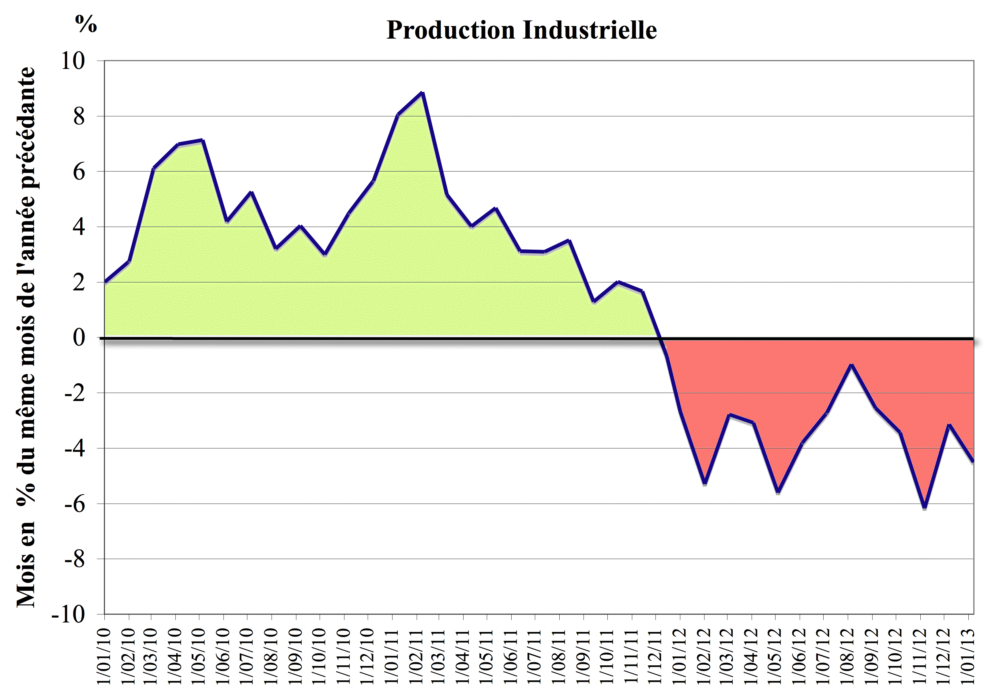 Questa perdita di posti di lavoro è stata particolarmente importante nel settore dell’industria. Anche in questo caso, non sorprende. La produzione industriale continua a diminuire. Può essere visto dal grafico seguente, che mostra il tasso di crescita annuale, vale a dire, come variazione percentuale rispetto al mese equivalente dell’anno precedente.