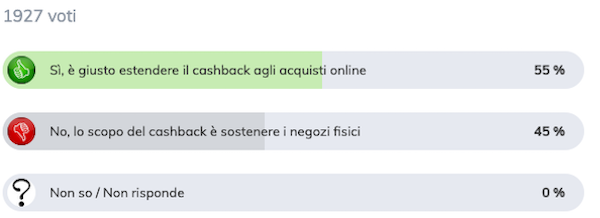 Guardando i risultati del sondaggio, che ricordiamo non ha un valore scientifico ma soltanto indicativo non essendo realizzato a campione, emerge come il 55% dei rispondenti sarebbe a favore dell’estensione anche all’online del cashback.