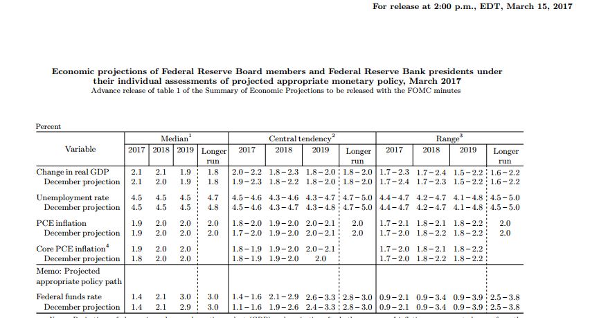 La mediana delle previsioni dei funzionari, palesato sul dot plot, implica che i tassi saliranno all’1.375% entro la fine del 2017, al 2,125% entro la fine del 2018, e al 3.000% entro la fine del 2019. Questo implica tre aumenti dei tassi di un quarto di punto percentuale nel 2017 e il 2018, lo stesso ritmo che funzionari avevano previsto a seguito della riunione dello scorso dicembre.