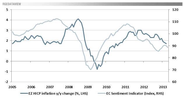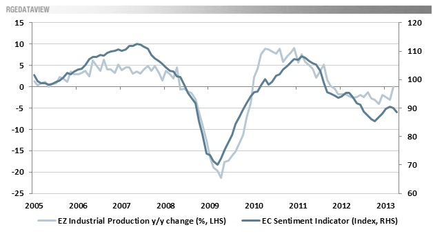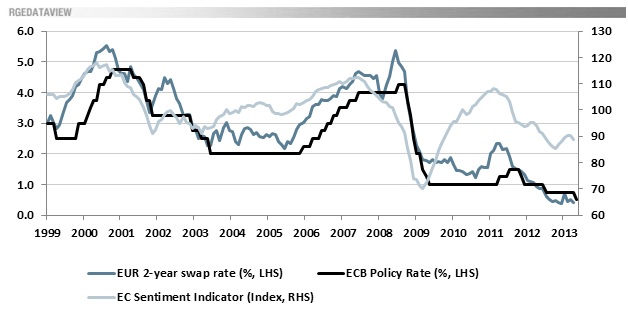 Più di recente, il taglio di 25 punti base al tasso di rifinanziamento è arrivato dopo una caduta di lunga durata nel sentiment, a partire dal gennaio 2011, ed è stato accompagnato da un calo della produzione manifatturiera.