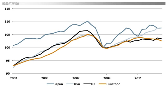 L’Eurozona è in ritardo rispetto alle altre principali economie sviluppate da quando è stato toccato il fondo della Grande Recessione nel 2009. La figura 1 mostra che, a partire dal quarto trimestre 2012, il PIL reale dell’Eurozona è cresciuto del 2,5% solo a partire dal primo trimestre 2009, a fronte di una crescita del 3,5% per il Regno Unito, e di un’espansione del 7,5% messa in scena da Stati Uniti e Giappone.