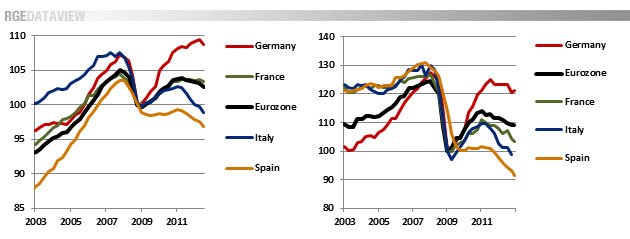 Le diverse fortune economiche di questi paesi si riflettono nelle rispettive dinamiche produttive. Gli indici della produzione industriale sono ora sotto il picco toccato nel primo trimestre 2008 in tutti quei paesi (tra cui la Germania), ma al di sopra del fondo del 2009 in Germania e in Francia (del 21% e 3%, rispettivamente), a circa lo stesso livello toccato dall’Italia nel 2009, e ben al di sotto del presunto "fondo" del 2009 toccato in Spagna (Figura 3). La Spagna e l’Italia hanno perso quasi il 40% e il 30% della loro capacità di produzione, il che segna un processo di de-industrializzazione di fatto costretto dalla crisi.