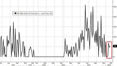 mostra come la scorsa settimana le importazioni Usa di petrolio russo abbiano toccato la media di 106.000 barili al giorno, mentre l’ultimo dato mensile a disposizione – quello di novembre 2021 – parla addirittura di 17,8 milioni di barili fra greggio degli Urali e prodotti derivati che hanno raggiunto gli Usa. Insomma, tutti hanno bisogno del petrolio di Mosca. Persino gli Usa. Ma ecco che questo secondo grafico