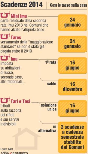 – per la TARI e la TASI: almeno due rate a scadenza semestrale i cui termini sono stabiliti da ciascun comune in maniera anche differenziata fra i due tributi. E’ prevista la possibilità del pagamento in un’unica soluzione entro il 16 giugno; - la Mini IMU: il prossimo 24 gennaio;