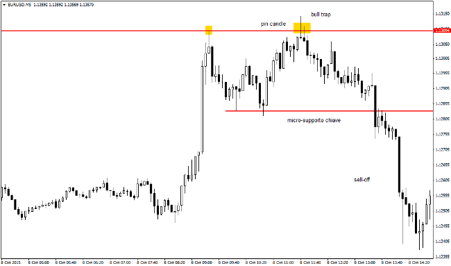 Il grafico a 5 minuti del “re del forex” evidenzia dapprima un movimento direzionale rialzista, poi la formazione di una base dopo un fisiologico pullback e quindi un nuovo tentativo di scardinare le resistenze di breve periodo. Sembra che il breakout sia imminente, ma dura solo pochi istanti: il tempo necessario per formare una bull trap, in grado di ingannare gli scalper e costringerli a una frettolosa ricopertura. La pin candle diventa un segnale short da sfruttare in ottica di scalping.