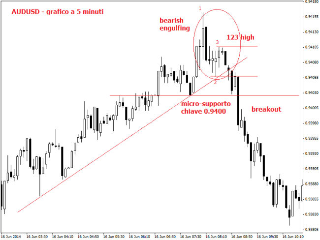 Pochi minuti più tardi si concretizza un ulteriore segnale ribassista, ovvero il pattern 123 high di Joe Ross. I segnali multipli consentono di aumentare le probabilità di successo della transazione short, che inizierà a dare i primi frutti dopo il breakout esplosivo del fondamentale micro-supporto di 0,94. Nel corso della giornata l’Aussie resterà sotto il tiro dei venditori, offrendo allo scalper una buona opportunità di profitto a fronte di un rischio iniziale decisamente contenuto.