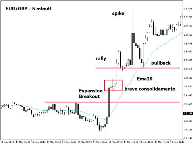 Il grafico in alto si riferisce al tasso di cambio EUR/GBP, ovvero euro su sterlina, time frame a 5 minuti. Si può notare la formazione di una candela di inversione del trend sui minimi di giornata e subito dopo un Expansion Breakout che supera una micro-resistenza. Il segnale long in ottica di scalping è molto preciso. Dopo un consolidamento di appena tre candele, ecco che il mercato riparte al rialzo offrendo una buona occasione di profitto nei minuti successivi.