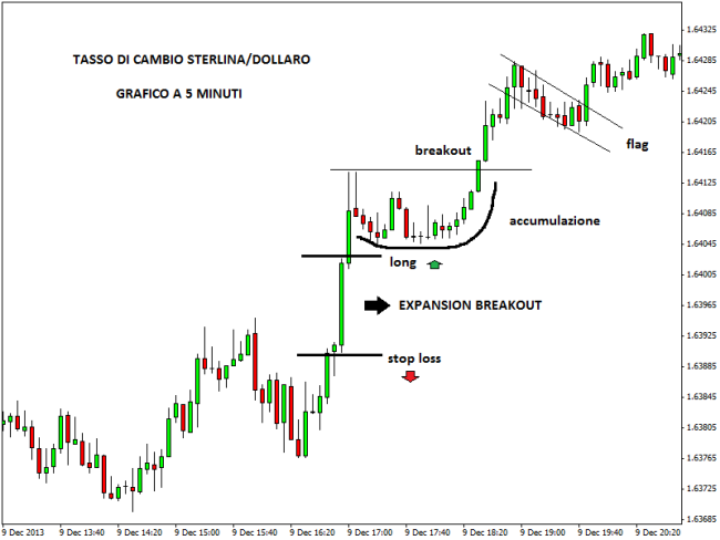 Ci siamo già occupati diverse volte del pattern expansion breakout, utile per individuare soltanto i veri breakout del prezzo. Jeff Cooper utilizza questo segnale soltanto su base multiday per fare position trading. Tuttavia questo pattern, se appositamente filtrato per evitare falsi segnali, può essere tranquillamente utilizzato anche su base intraday, in particolare sul grafico a 5 minuti che è probabilmente il miglior time frame per fare scalping. Per capire come tradare un tipico segnale di expnansion breakout intraday, andiamo a vedere un esempio grafico.