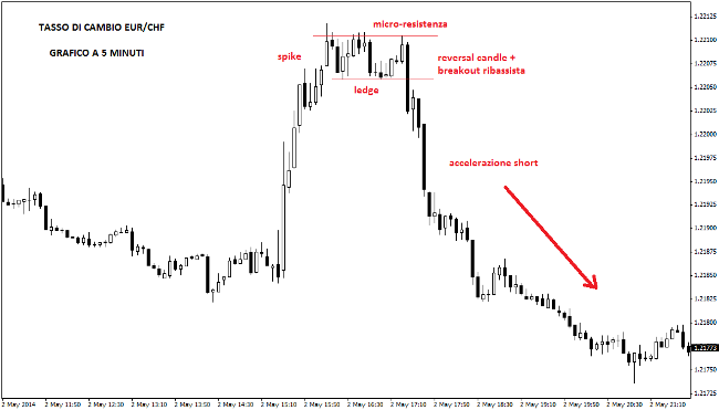 Il grafico a 5 minuti mostrato in alto evidenzia un classico spike & ledge, un pattern di inversione del trend caratterizzato da una iniziale brusca accelerazione dei prezzi e dall’incapacità degli stessi di proseguire lungo il trend principale. Dopo lo spike, ovvero il movimento finale in genere successivo a un ripido boom direzionale, si forma un ledge, che identifica una fase di consolidamento sui top. La tenuta della micro-resistenza e il successivo breakout ribassista danno il via a un sell-off molto robusto, che offre allo scalper una buona occasione di profitto.