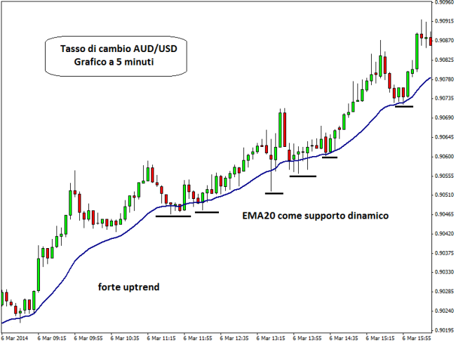 In pratica, ogni volta che i prezzi approdano sulla EMA20, si configura una potenzialità occasione di trading intraday. Meglio ancora se si forma anche un altro segnale di analisi tecnica affidabile, in modo tale da cumulare le probabilità di successo. Nel lungo periodo questo aspetto è di fondamentale importanza per lo scalper, che avrà così sempre buone chance di centrare il timing giusto. Il grafico in alto relativo al tasso di cambio AUD/USD, time frame a 5 minuti, mostra un solido uptrend intraday e le varie possibilità di ingresso al test della EMA20, che funge da supporto dinamico.