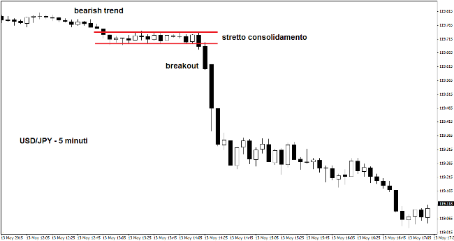 L’esempio mostrato in alto si riferisce al tasso di cambio Usd/Jpy, dollaro americano su yen giapponese, time frame a 5 minuti. Si può notare la comparsa di una strettissima congestione intraday e il successivo breakout ribassista, che indica un’opportunità short in ottica di scalping. Grazie anche alla volatilità creata dalla pubblicazione di un market mover, il cambio dollaro/yen si dirigerà presto su valori minimi intraday facendo risultare il trade short molto profittevole.