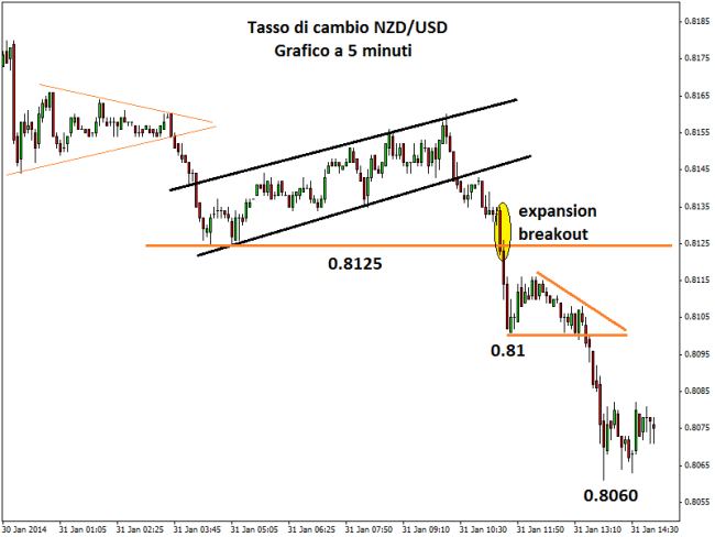In pratica si cerca il momento esatto in cui il prezzo inizia ad accelerare verso una direzione precisa. Dal grafico in alto si può notare che il Kiwi, prima ancora della comparsa del pattern, aveva evidenziato una tendenza maggiormente orientata al ribasso. Il segnale dell’expansion breakout short sul time frame a 5 minuti è stato, però, fondamentale per capire che c’erano i presupposti per un sell-off ragguardevole. Alla fine i prezzi hanno perforato un’area di supporto intraday importante e poi anche una soglia psciologica, spingendosi facilmente al ribasso formando nuovi minimi di giornata.