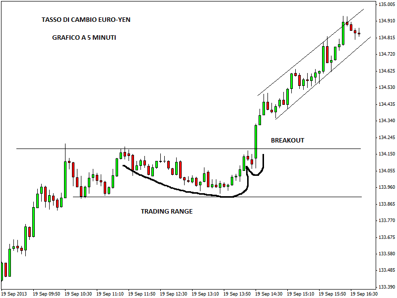 L’ideale è aspettare una fase di consolidamento per poi provare a prendere posizione sul breakout di una congestione, meglio se stretta e quindi con bassa volatilità. Solitamente queste fasi laterali di accumulazione o distribuzione del trend avvengono tra le ore 13 e le ore 14, mentre il breakout nella direzione della tendenza primaria può anche avvenire sui dati macroeconomici americani delle ore 14.30. Per capire meglio questo argomento si può dare un’occhiata al grafico in alto del cambio euro-yen, time frame a 5 minuti, interessato da una giornata ad ampio range.