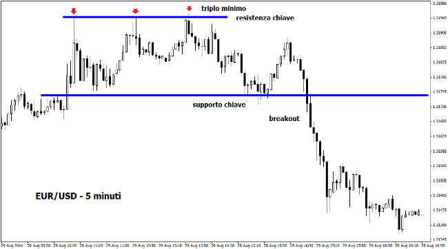 Il grafico mostrato in alto si riferisce al tasso di cambio EUR/USD, soprannominato il “re del forex” visto che copre quasi un quarto di tutti gli scambi giornalieri sul mercato valutario globale. Si può notare un movimento rialzista che non riesce ad approfondire ulteriormente gli swing verso l’alto, in quanto la presenza della resistenza chiave di area 1,32 è piena zeppa di venditori. Ben presto si forma un pattern grafico short molto affidabile, ovvero il triplo massimo. In questa zona di vendita lo scalper può posizionarsi short, beneficiando di un rapporto rischio/rendimento decisamente accattivante. Il trade si concluderà entro la giornata con un guadagno notevole, a fronte di un piccolo rischio iniziale.