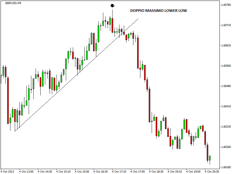 Se osserviamo il grafico a 5 minuti del tasso di cambio sterlina-dollaro, il cosiddetto cable, possiamo notare la comparsa del pattern e la sua capacità di segnalare con precisione un punto di massimo del mercato intraday. Questo genere di pattern garantisce spesso delle ottime opportunità di scalping, tra l’altro caratterizzate sempre da un basso rischio iniziale e da un potenziale rendimento elevato.