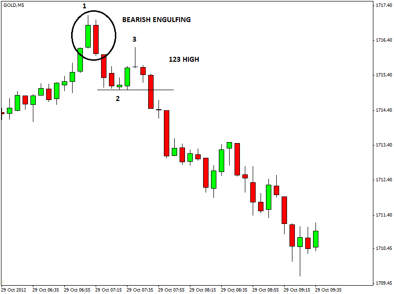 Il pattern “engulfing” resta uno dei migliori per fare trading di precisione nell’intraday. Permette di individuare l’area di massimo o di minimo con una precisione chirurgica e di effettuare interessanti operazioni di scalping a basso rischio. Nell’esempio in basso sull’oro, grafico a 5 minuti, si può notare l’inversione del trend rialzista a seguito della comparsa di due pattern molto potenti.
