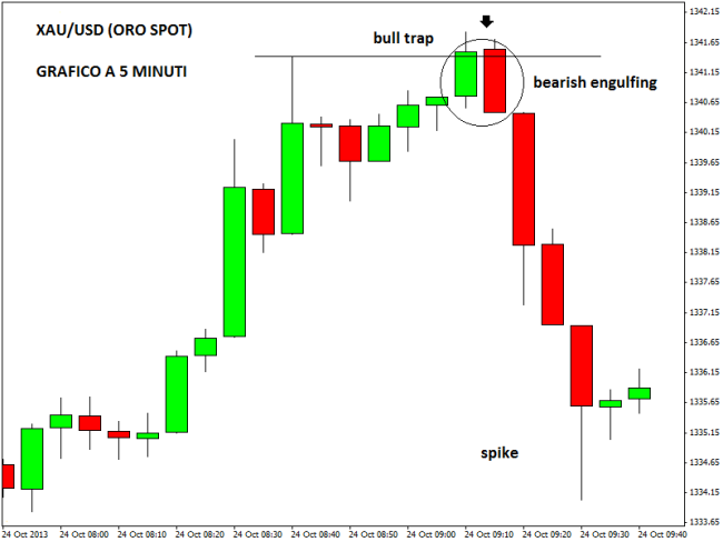 Andiamo a vedere l’esempio di oggi, riferito al mercato dell’oro spot. Il time frame utilizzato per lo scalping è di solito il 5 minuti, che ritengo perfetto per fare un trading di brevissimo respiro. Il case study mostra la formazione di un bearish engulfing, che appare dopo una bull trap su una zona di micro-resistenza. Il segnale short è netto e può offrire un’opportunità di trading con un buon rapporto rischio/rendimento. Quando appare lo spike, lo scalper dovrebbe chiudere completamente la propria posizione.