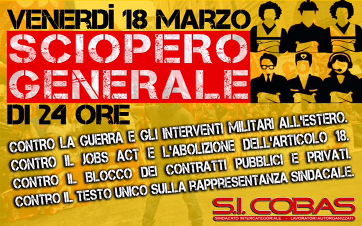 Il 18 marzo del 2016 i sindacati CUB (Confederazione Unitaria di Base), SI COBAS (Sindacato intercategoriale Cobas lavoratori Autorganizzati) e la Segreteria Nazionale dell’Unione Sindacale Italiana hanno indetto uno sciopero generale di rilevanza nazionale.