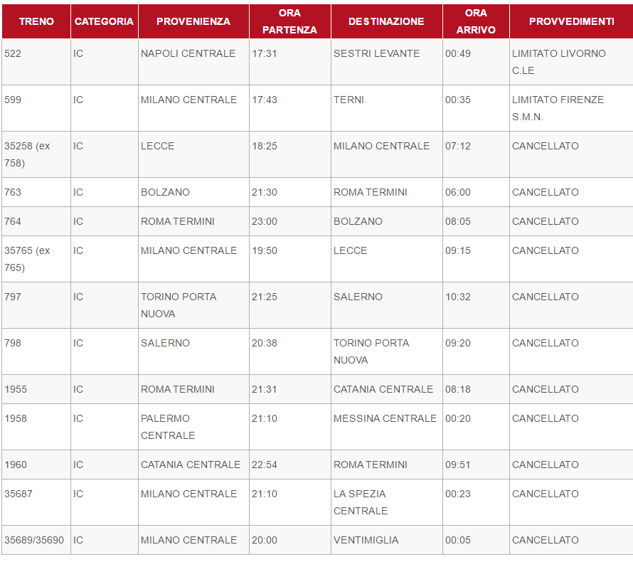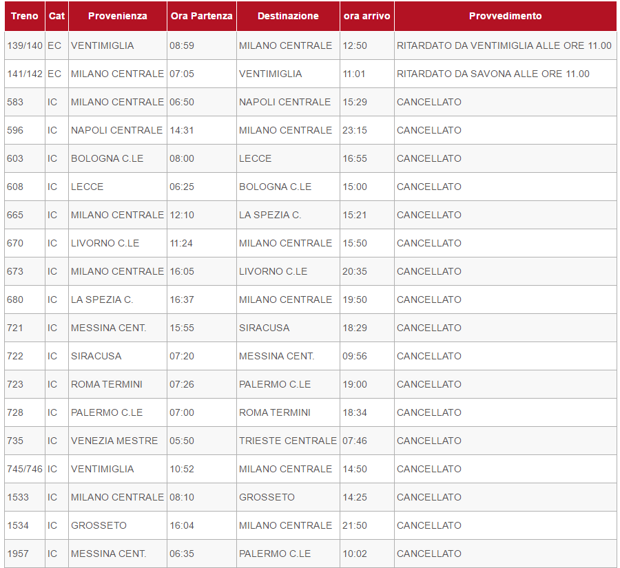 Qui il programma di circolazione dei treni IC durante lo sciopero di sabato 23 luglio: